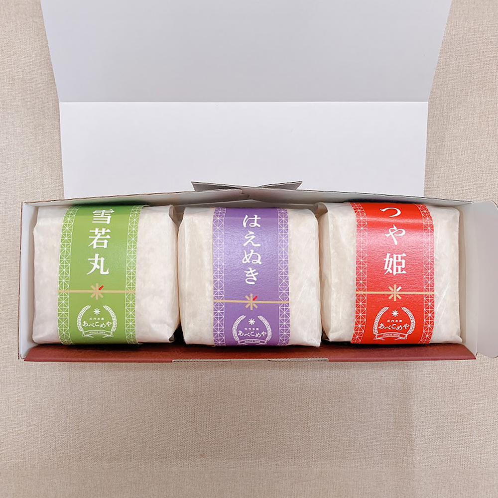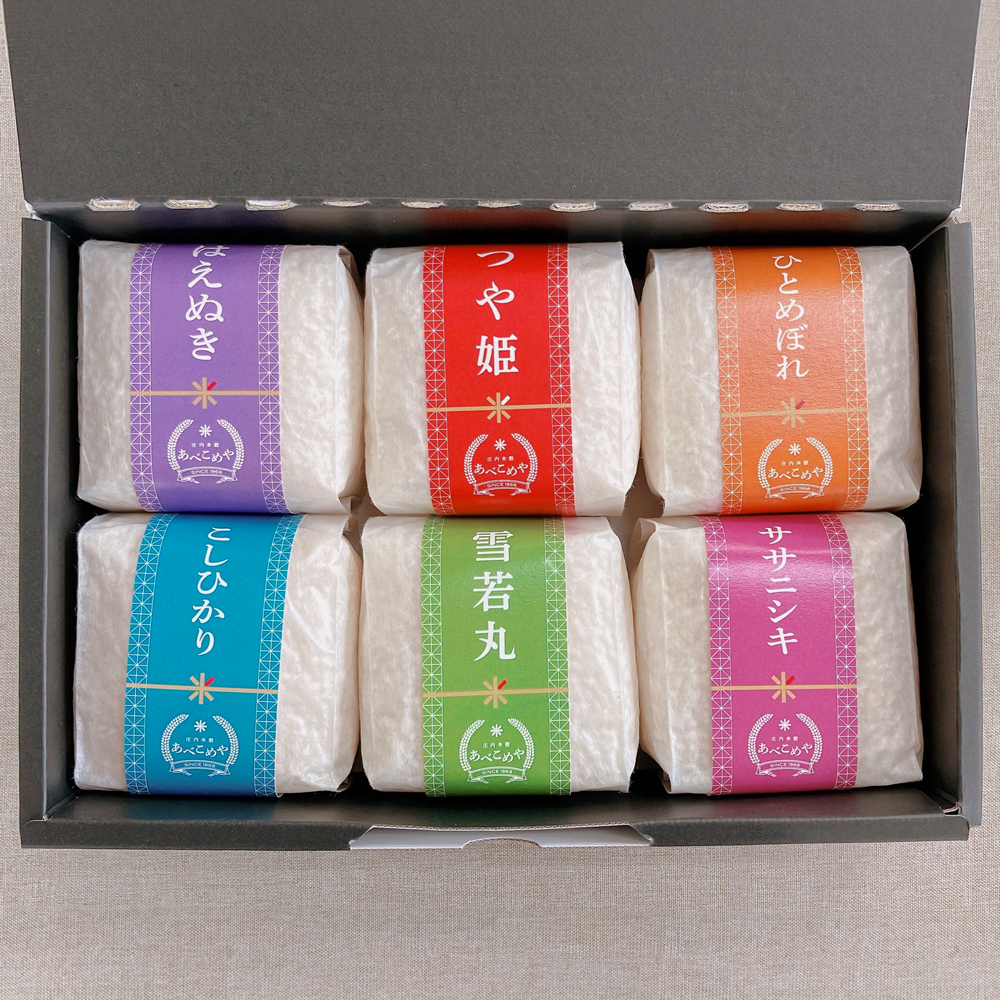米どころ・酒田市で半世紀以上続く「あべこめや」。お米の販売のみならず、笹巻や赤飯といった加工品の製造・販売や、委託精米の請け負いなども手掛ける、地域の頼れる米穀会社です。今回は、山形県産米を贅沢に詰め合わせた「味くらべセット」をご紹介します。ラインナップは、はえぬき・つや姫・ひとめぼれ・コシヒカリ・雪若丸・ササニシキの6品種。食べ切りやすい300g(2合)ずつの個包装にしました。食べ比べはもちろん、料理に合わせた使い分けも楽しめますよ。大切な方へのギフトにもぴったり!